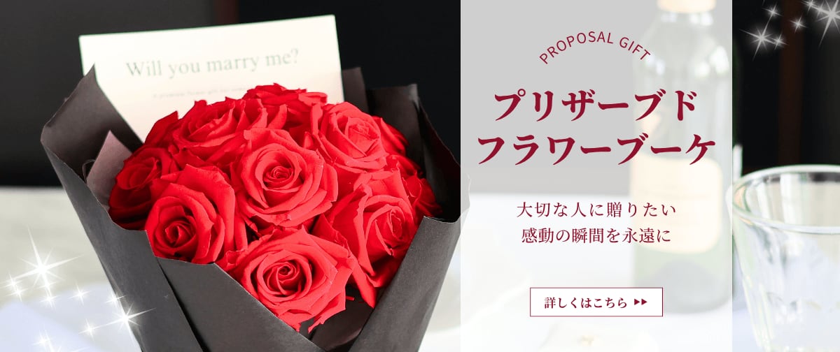 長く美しく咲き続ける花束で、永遠の想いを届ける 特別な日の贈り物に、プリザーブドフラワーのブーケはいかがでしょうか。 水やり不要で長く美しさを楽しめるため、大切な瞬間を永遠に彩ります。 【ダーズンローズ(12本のバラ)について】 ダーズンローズは、古くから「愛を誓う花束」として知られ、プロポーズや特別な贈り物に選ばれています。 それぞれのバラには「愛」「誠実」「感謝」「情熱」「希望」「尊敬」「幸福」「信頼」「努力」「誇り」「真実」「永遠」という意味が込められており、大切な人への深い想いを象徴します。 12本のバラを贈ることは、「あなたのすべてを受け入れ、永遠に愛し続けます」という誓いの表れです。大切な瞬間を特別なものにする、最高の花束です。 【スタンドブーケの魅力】 アクリルポットにお花を挿した状態でラッピングされており、花瓶を用意する手間なくそのまま飾ることができます。 【使用花材】 バラ(12本) ※天然素材のため、サイズや色に多少のばらつきがございますのでご了承ください。 ※パソコン環境により、実際の商品と色が異なる場合がございます。 【ギフト対応】 ・ご注文者さまとお届け先を別にご指定いただけますので、贈り物として直接お届けすることができます ・金額の分かる書類は同封いたしません ・メッセージカードつき ・プリザーブドフラワーの取扱説明書つき 【ギフトラッピング】 ・透明袋での無料ラッピング付きです ・クリアケースラッピング(+500円) ほこりが入りにくく、長く美しい状態を保ちながら飾っていただけます。 ・ギフトバッグ(+300円) 持ち運びや直接お渡しの際に便利です。 オプションよりお選びいただけます。 【無料メッセージカード】 ・デザイン違いで全12種類からお選びいただけます ・「Happy Birthday」「Thank You」など定型文入りカード ・お好きなメッセージを印字することも可能です(60文字以内) ・絵文字や特殊文字はご使用いただけません ・手書き用の無地カードもお選びいただけます オプションよりご希望のカードをお選びください。 【ライトストーンピック】 花束にプラスできるキラキラのピック。 イニシャルや記念日を組み合わせて、オリジナルギフトにできます。 一点からご注文頂けます。組み合わせは備考欄にご記入ください。 【こんなシーンにおすすめ】 ・プロポーズのサプライズに:枯れない花束で「永遠の愛」を伝えたい特別な瞬間に ・誕生日や母の日のギフトに:大切な人への感謝や愛情を込めたプレゼントとして ・結婚祝いや記念品に:華やかなプリザーブドフラワーブーケで、一生の思い出に 【よくある質問(FAQ)】 Q. どのくらい持ちますか? A. 環境にもよりますが、1~2年以上美しさを保ちます。 Q. 配送時に崩れませんか? A. 専用ギフトボックスで丁寧に梱包し、安全にお届けします。 【ご注文について】 ・ご注文後に制作し、入金確認後3営業日以内に発送いたします ・配送時間帯とお届け日の指定が可能です ・在庫状況により、画像と異なる花材を使用する場合がございます ・配送トラブルによる破損があった場合は、到着後7日以内にご連絡ください